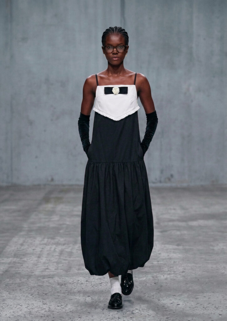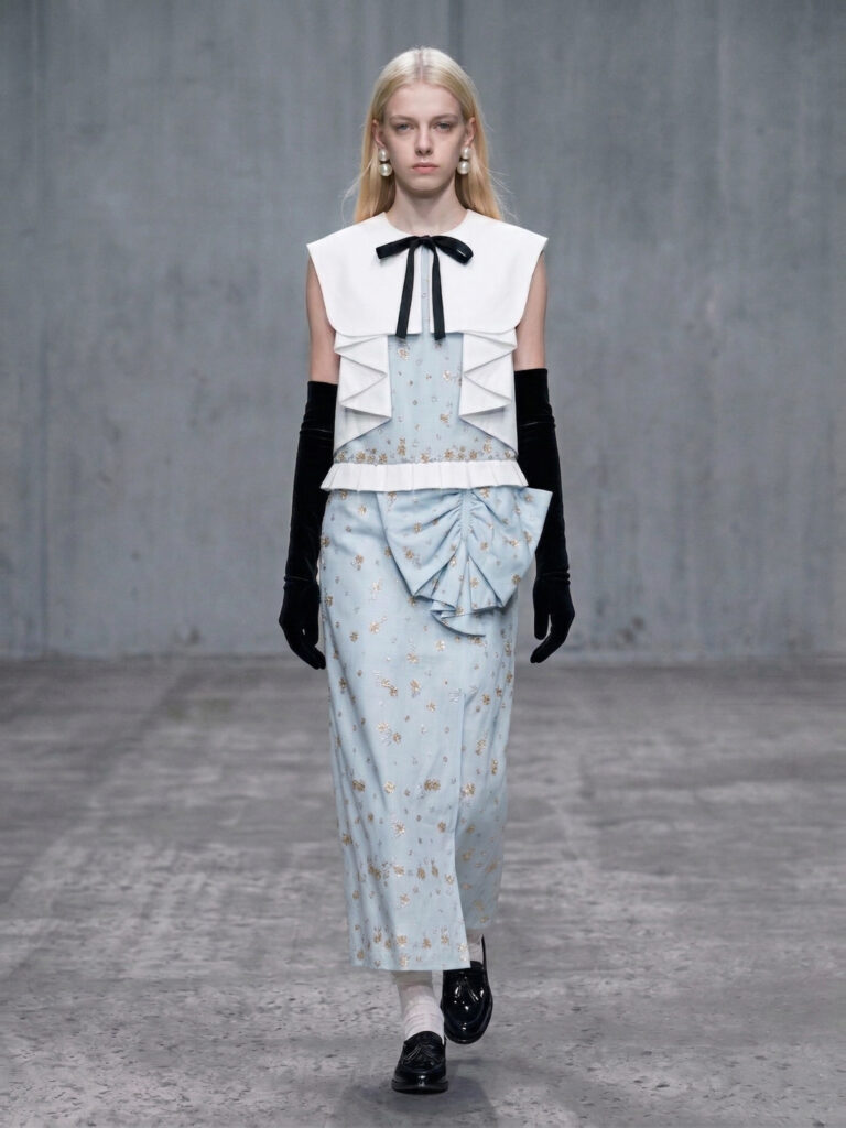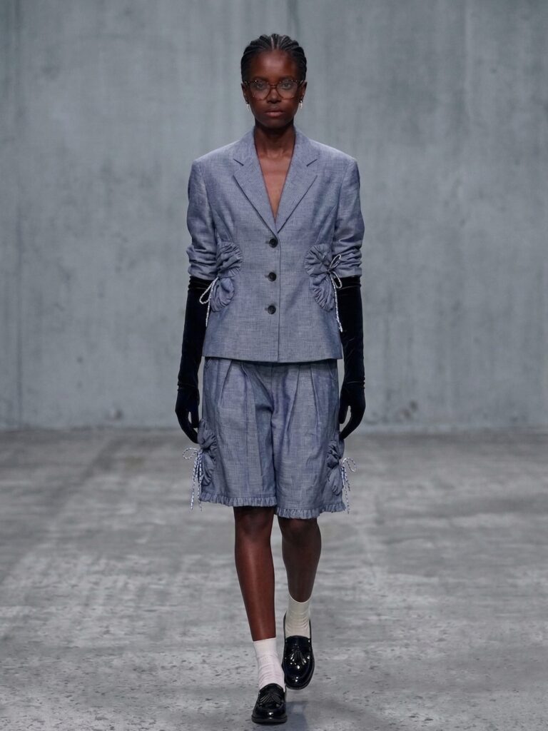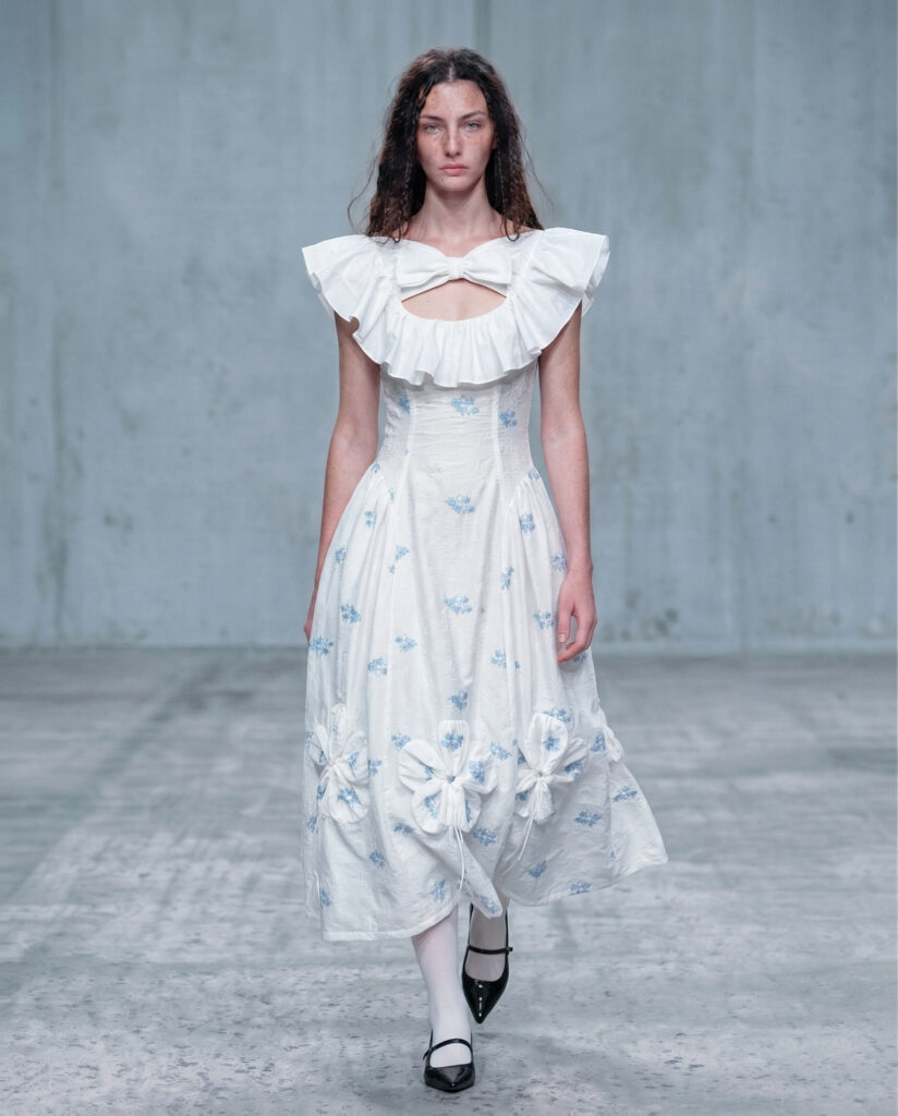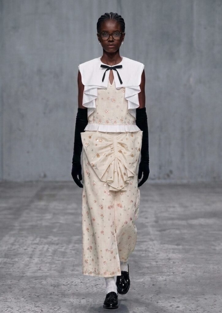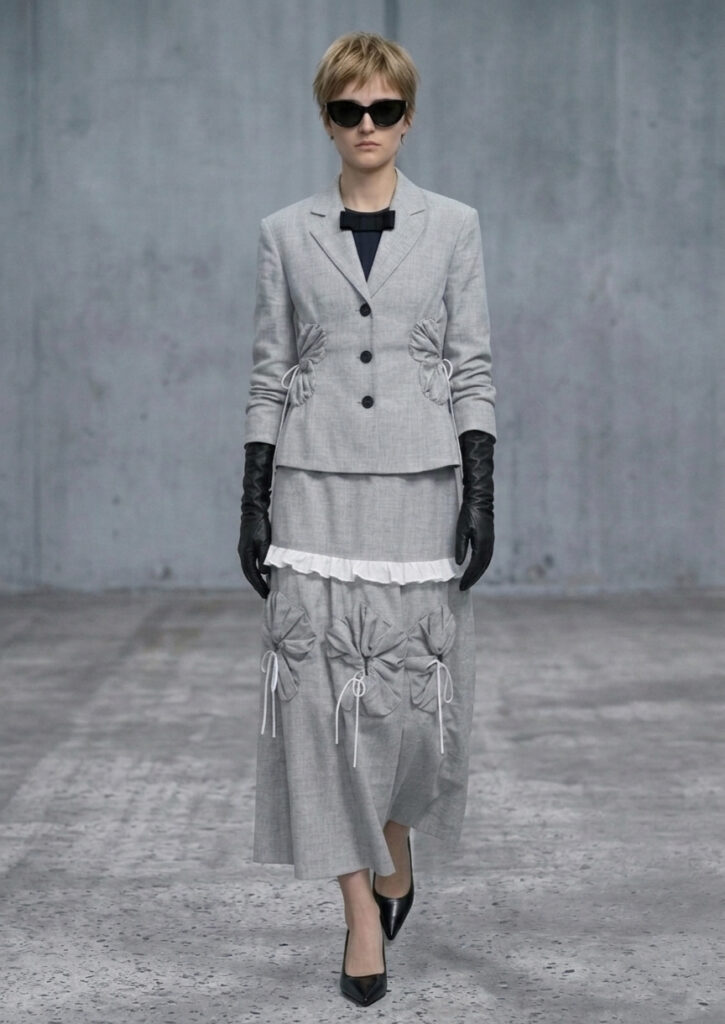Floral forms run throughout the collection—not as natural growth, but as constructed elements shaped from patterns and embedded into tailored structures. These blooms are not merely soft; they act as interventions, asserting presence within systems of order and control.