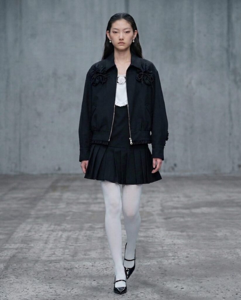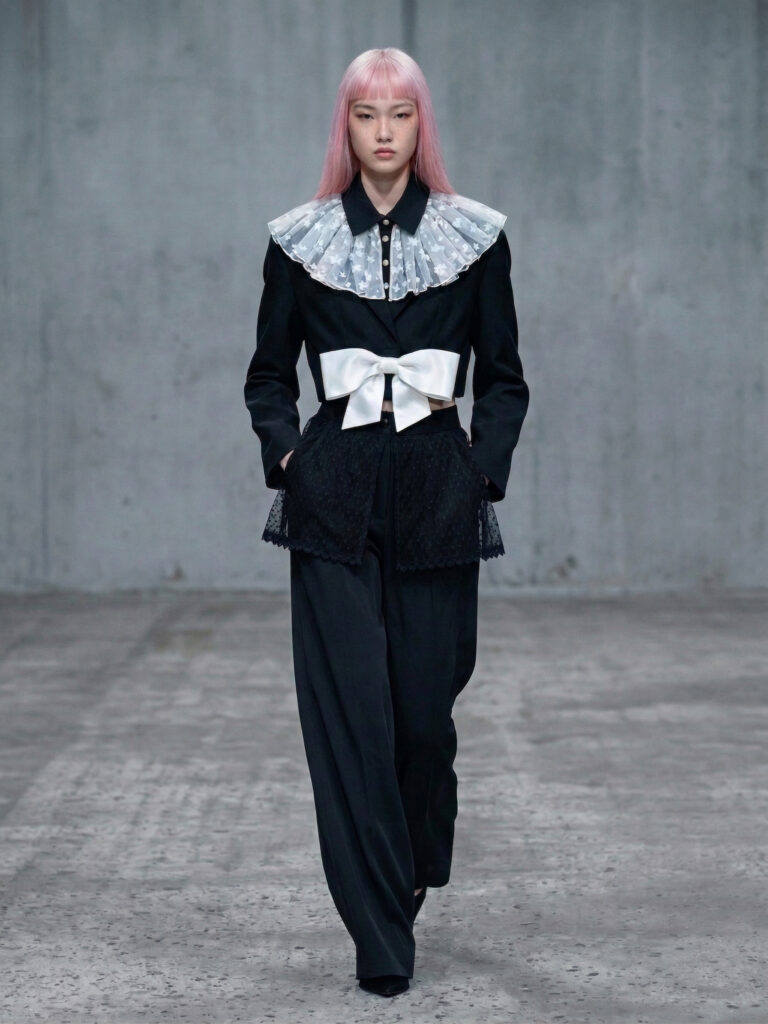 A constant tension exists between structure and softness. Tailoring acts as both armor and constraint, while the blooms interrupt its rigidity—soft, yet never compliant.